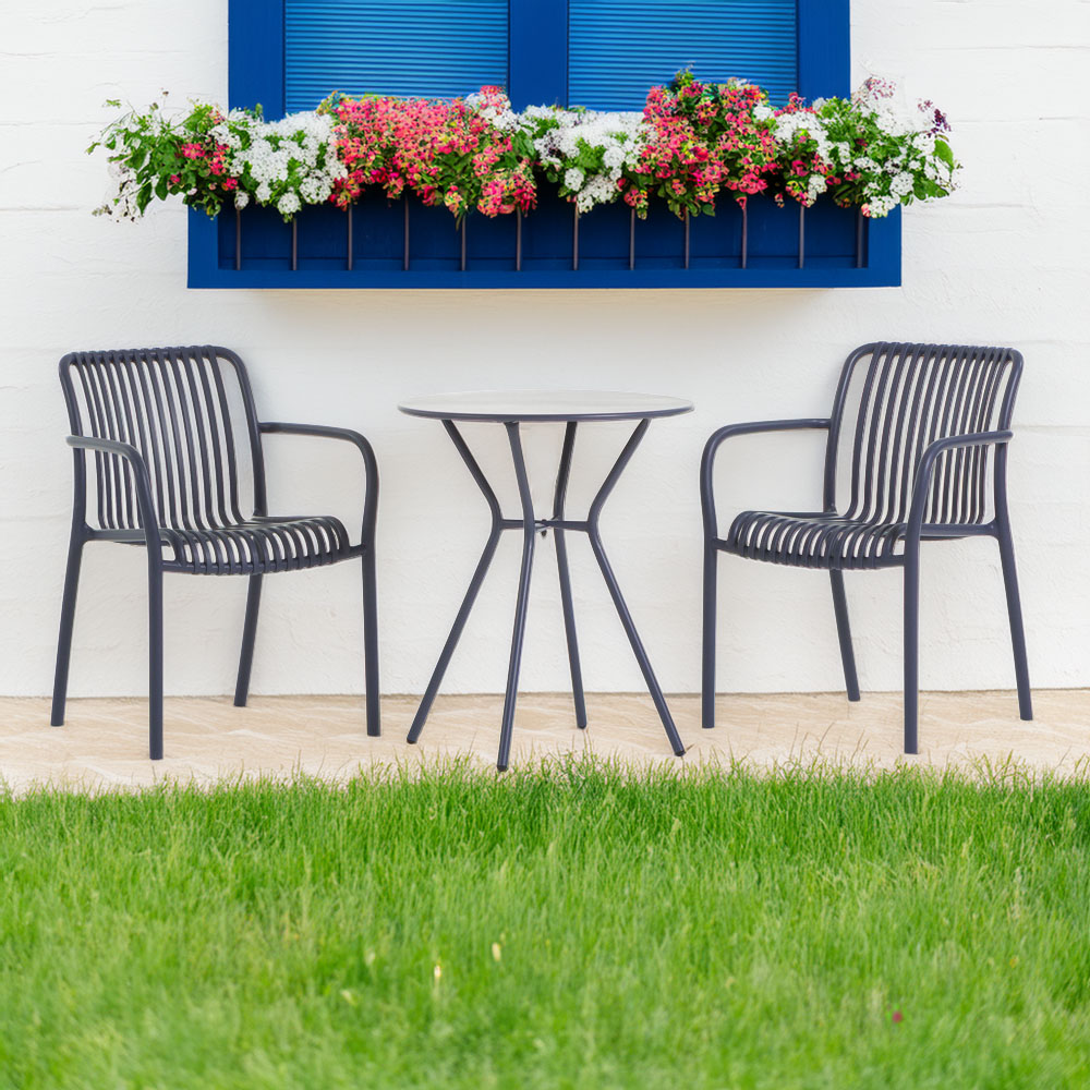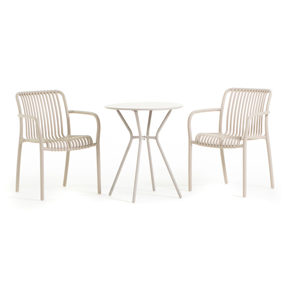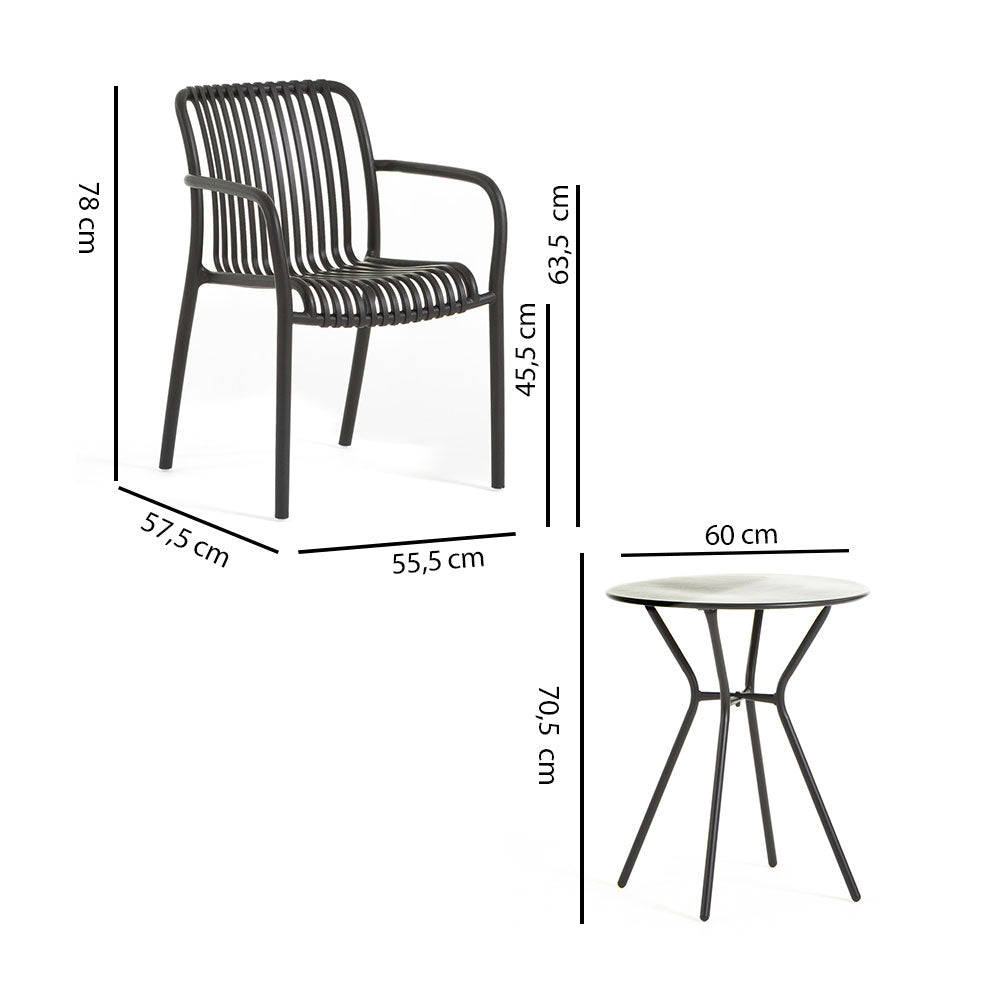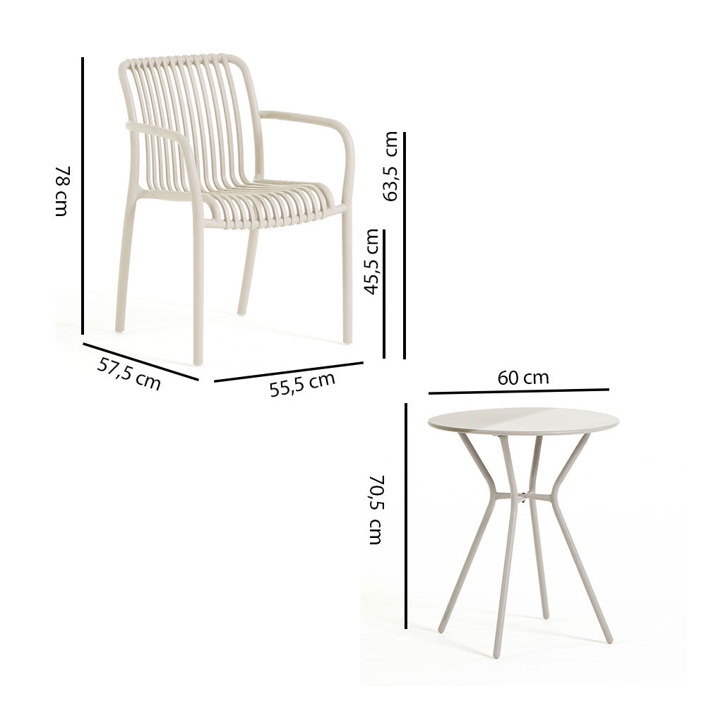 Composed of two stackable armchairs and a round table with a Ø60 cm top, this set is ideal for creating a cozy and practical corner on balconies, terraces, or in outdoor areas of bars, bistros, and cafés.