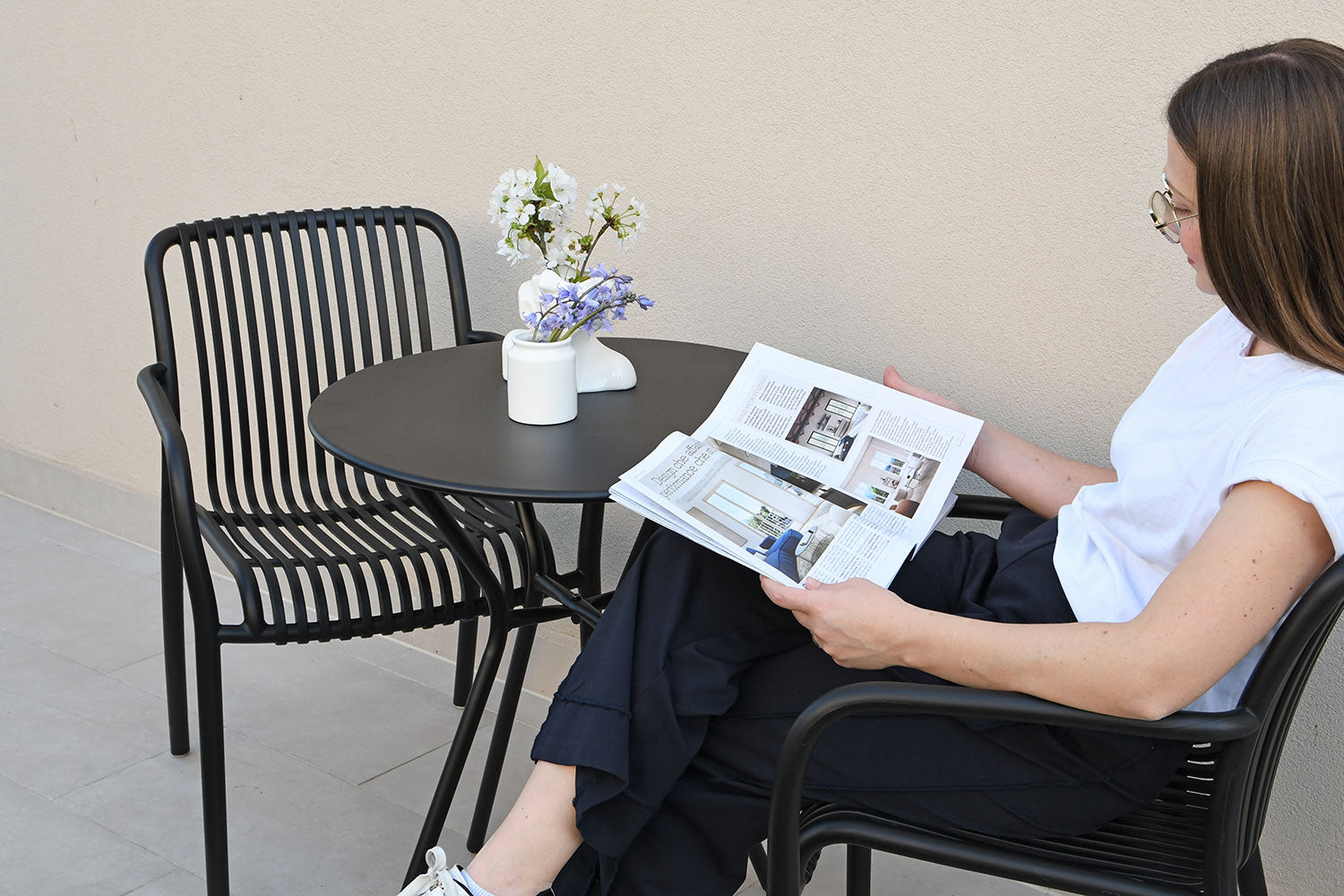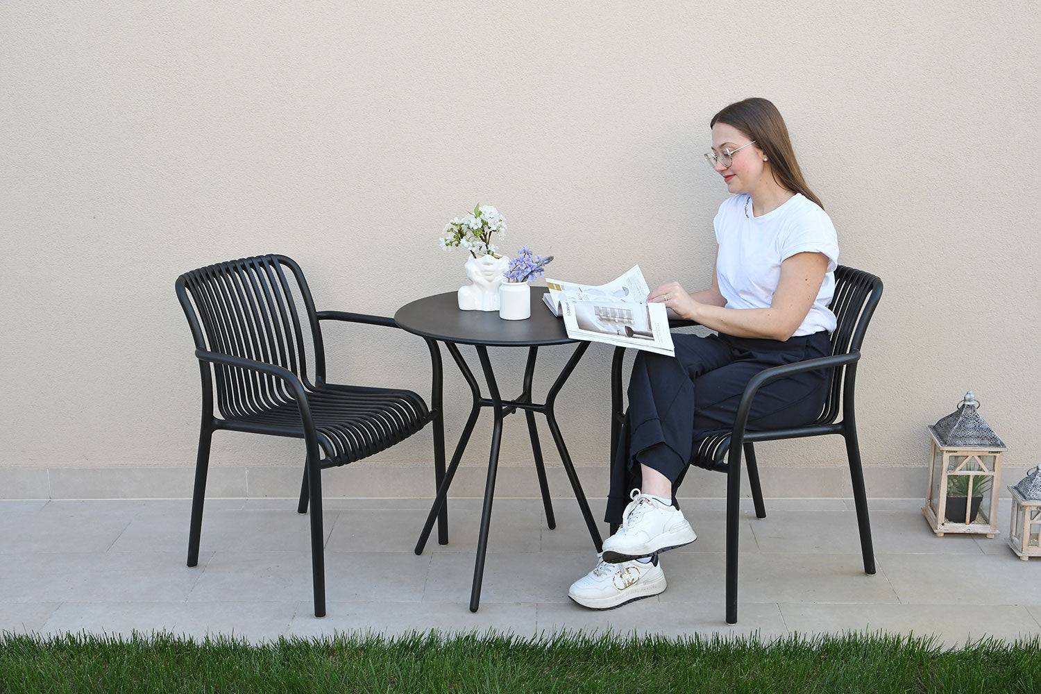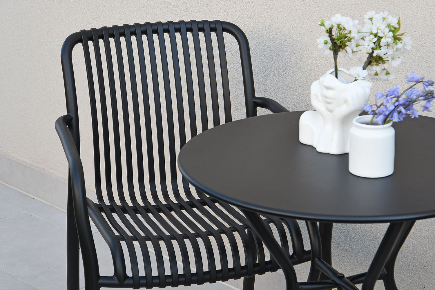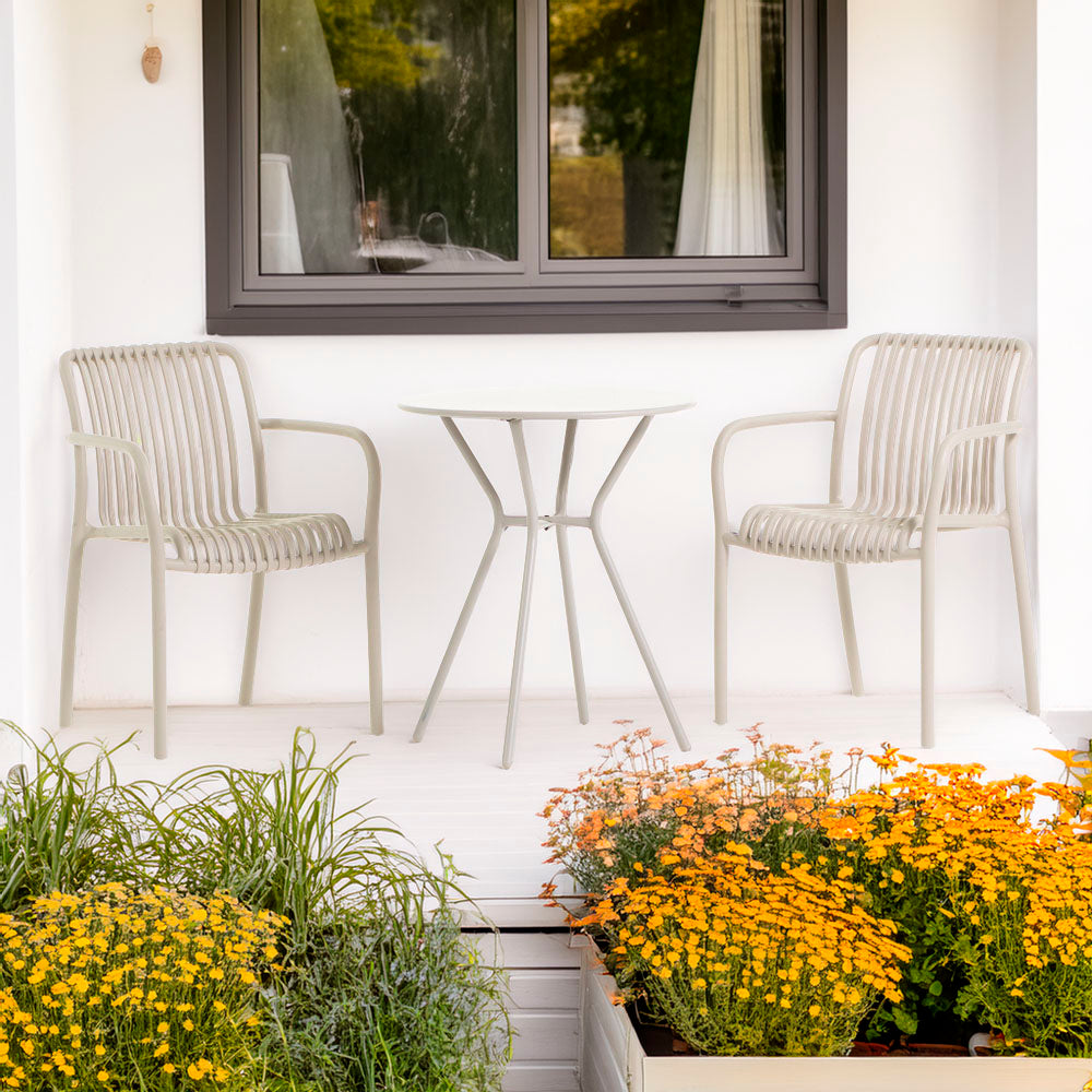 Composed of two stackable armchairs and a round table with a Ø60 cm top, this set is ideal for creating a cozy and practical corner on balconies, terraces, or in outdoor areas of bars, bistros, and cafés.