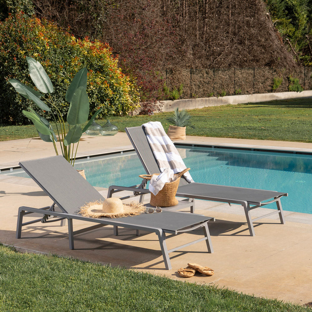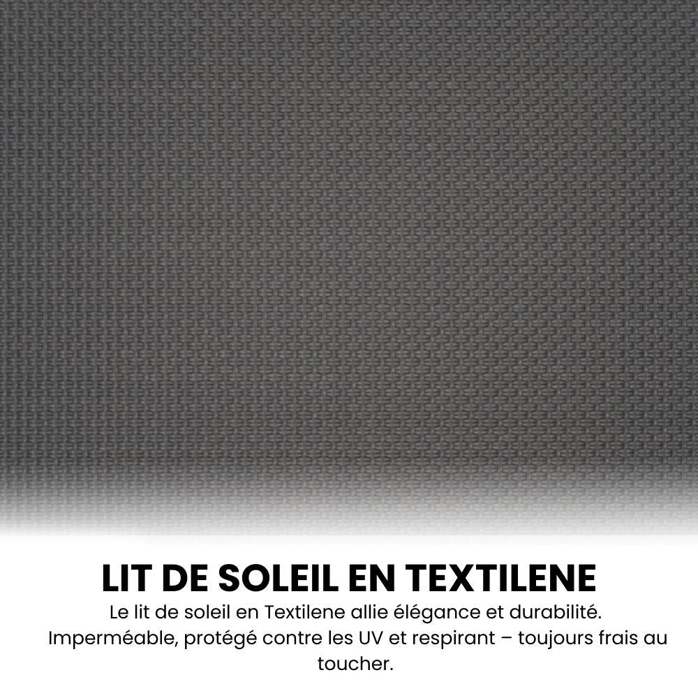 Questa coppia di lettini con tavolino è la scelta perfetta per chi desidera relax e comodità in giardino, terrazza o a bordo piscina. I lettini sono realizzati con una robusta struttura in alluminio, che garantisce resistenza e leggerezza, mentre la seduta e lo schienale sono in textilene 2x1, un materiale innovativo, impermeabile e traspirante, che offre comfort e durata nel tempo.
