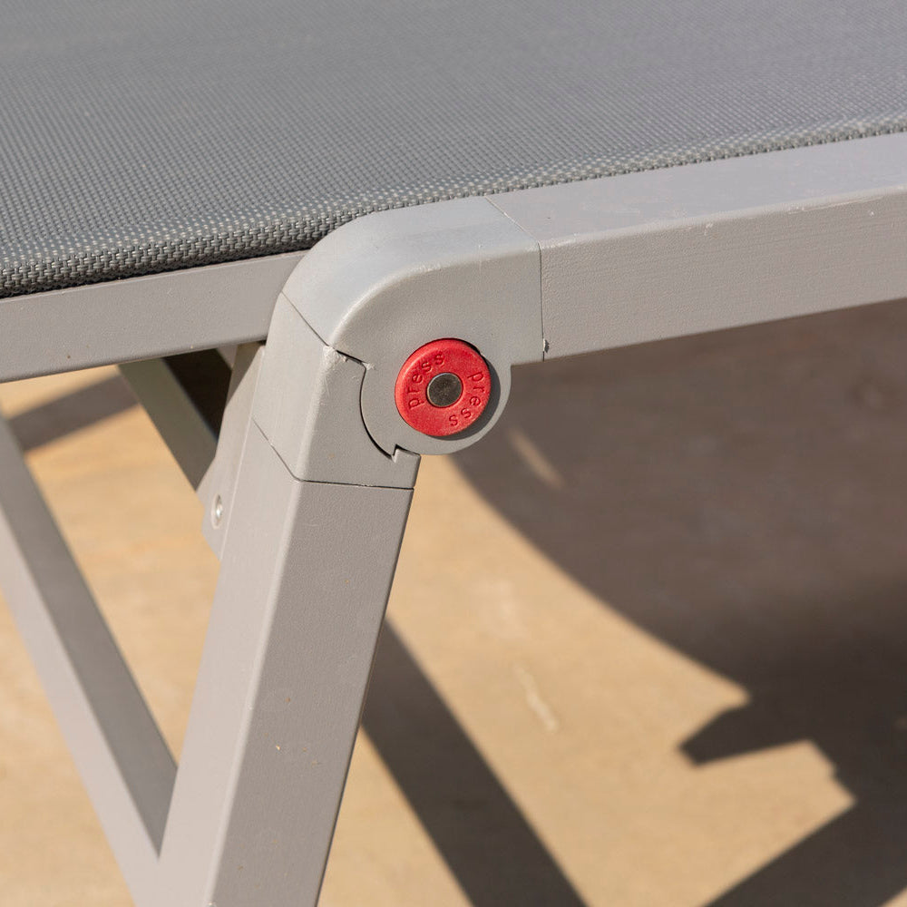 Il set include un elegante tavolino in alluminio dalle dimensioni di 45,7x32,4 cm, perfetto per appoggiare bevande, libri o altri oggetti personali. Il tavolino, così come i dettagli dei lettini, è rifinito in un sobrio ed elegante colore grigio, che si abbina perfettamente al design contemporaneo dei lettini.