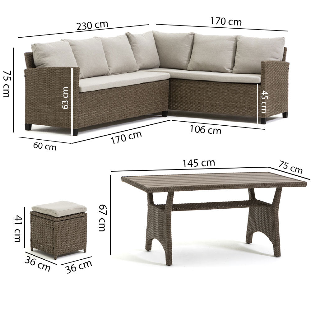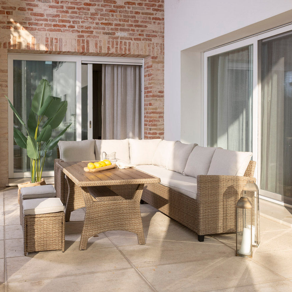 La struttura in metallo è rivestita da una raffinata trama in polyrattan intrecciato, con sfumature di marrone e beige che donano un tocco caldo e naturale all’ambiente. I cuscini color crema, morbidi e ben imbottiti, creano un piacevole contrasto cromatico e invitano al relax.