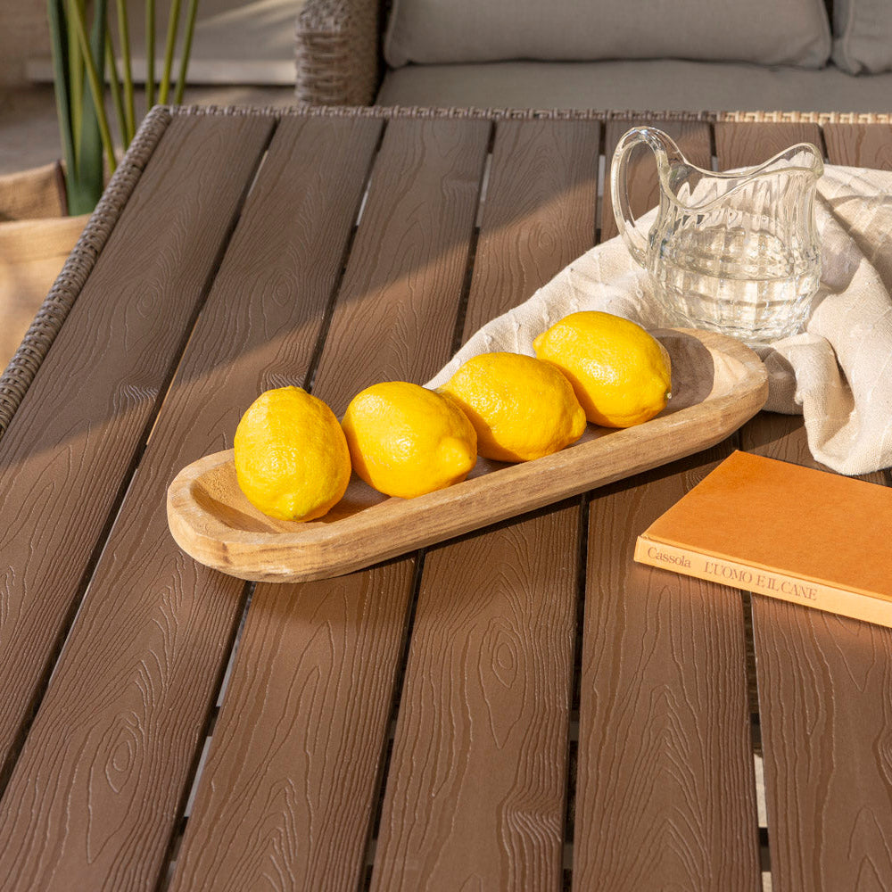 Il tavolo (145x75 cm) completa il set con un bordo elegante e un piano in polywood dall’aspetto naturale, perfetto per pranzi, aperitivi o semplici momenti di convivialità in giardino, terrazzo o veranda.