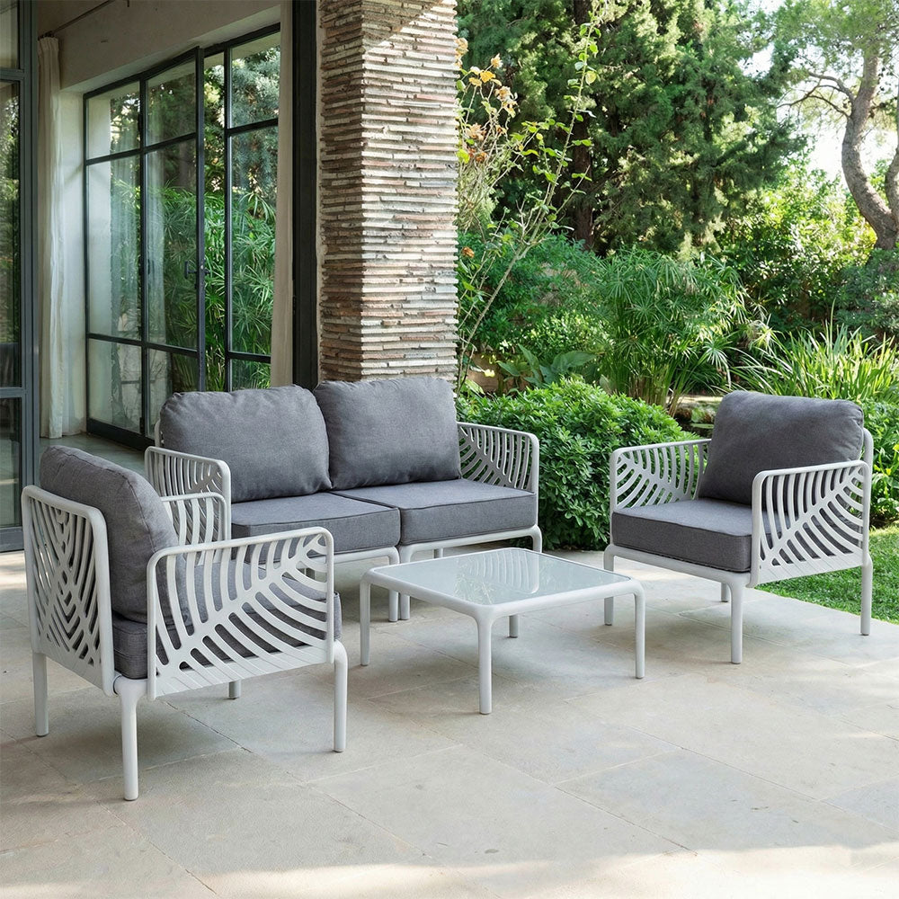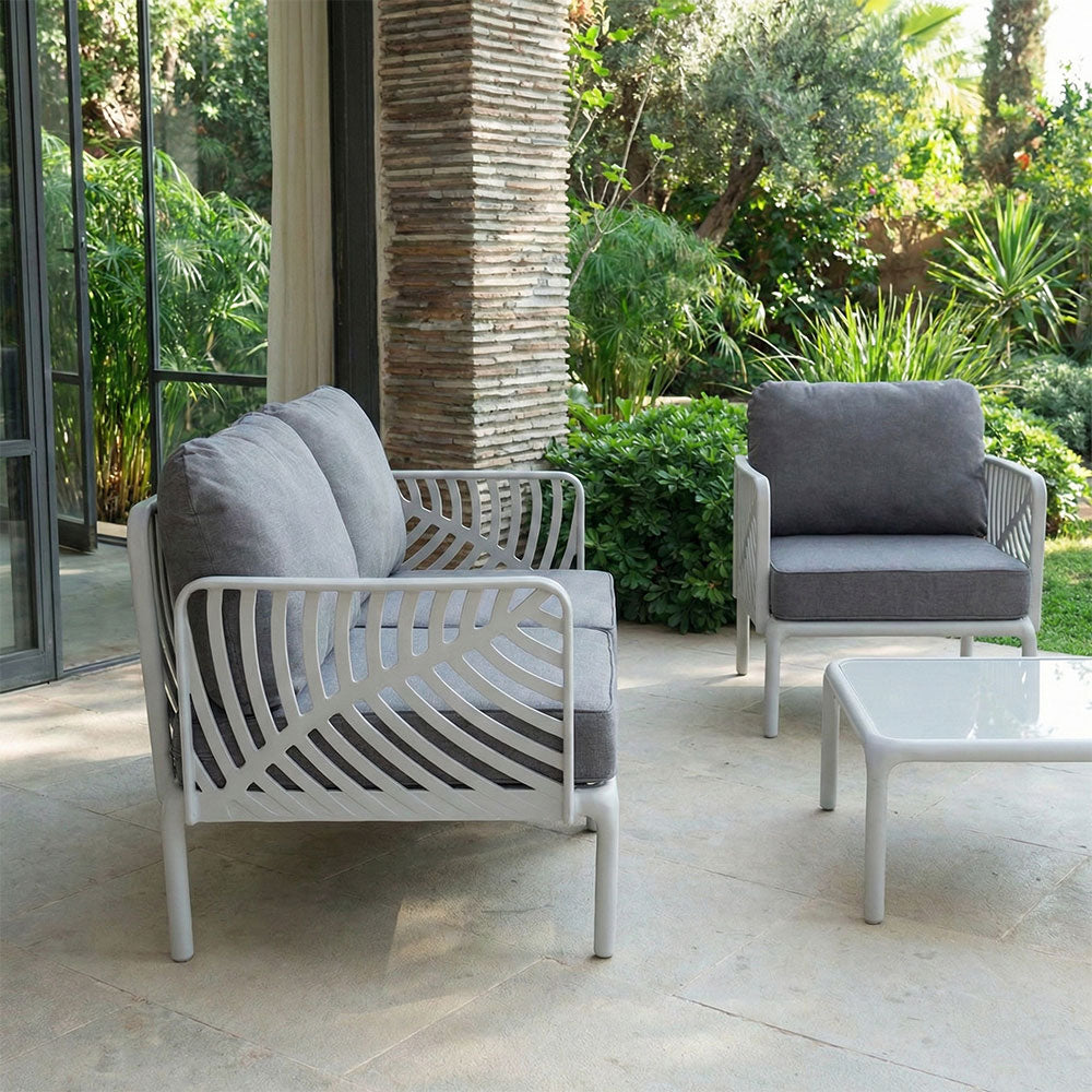 The set includes a spacious sofa, two armchairs and a coffee table with a tempered glass top, ideal for completing the outdoor living area with functionality and elegance. The name Kenzia is inspired by the leaves of the plant of the same name, from which the distinctive design of the armrests is drawn. The armrests feature an organic, enveloping pattern that adds lightness and personality to the set.