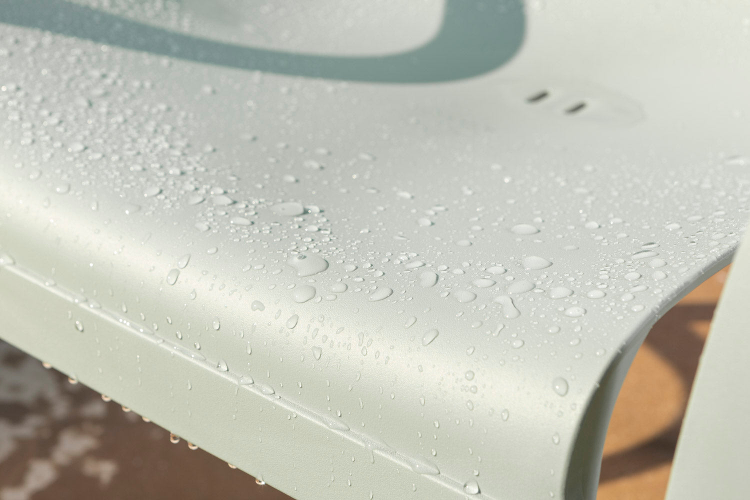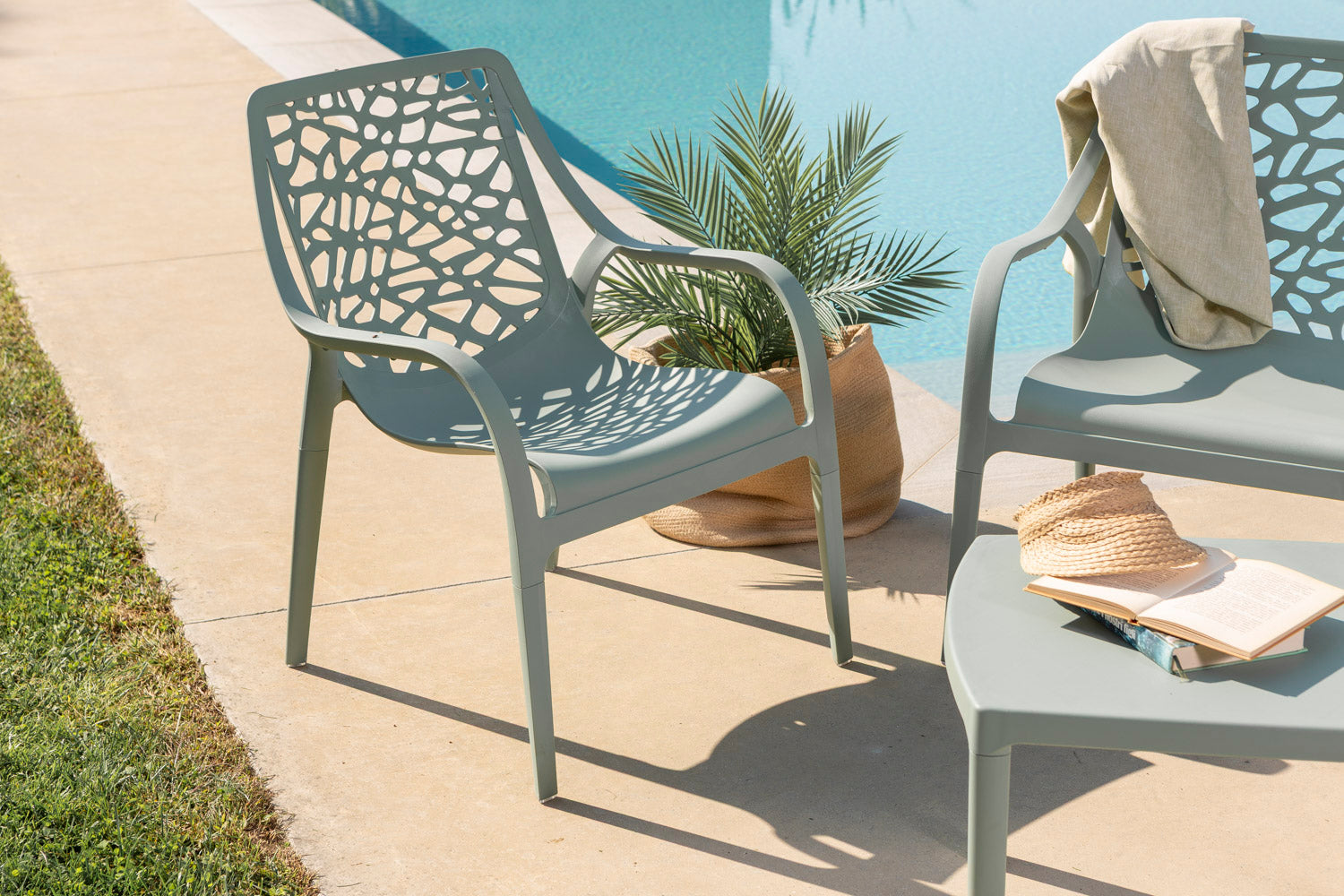 Le sedute sono impilabili, consentendo di ottimizzare lo spazio quando non in uso, mentre la struttura leggera facilita lo spostamento e la disposizione in base alle esigenze. Il tavolino abbinato completa il set, offrendo un comodo piano d’appoggio per momenti di relax all’aperto.