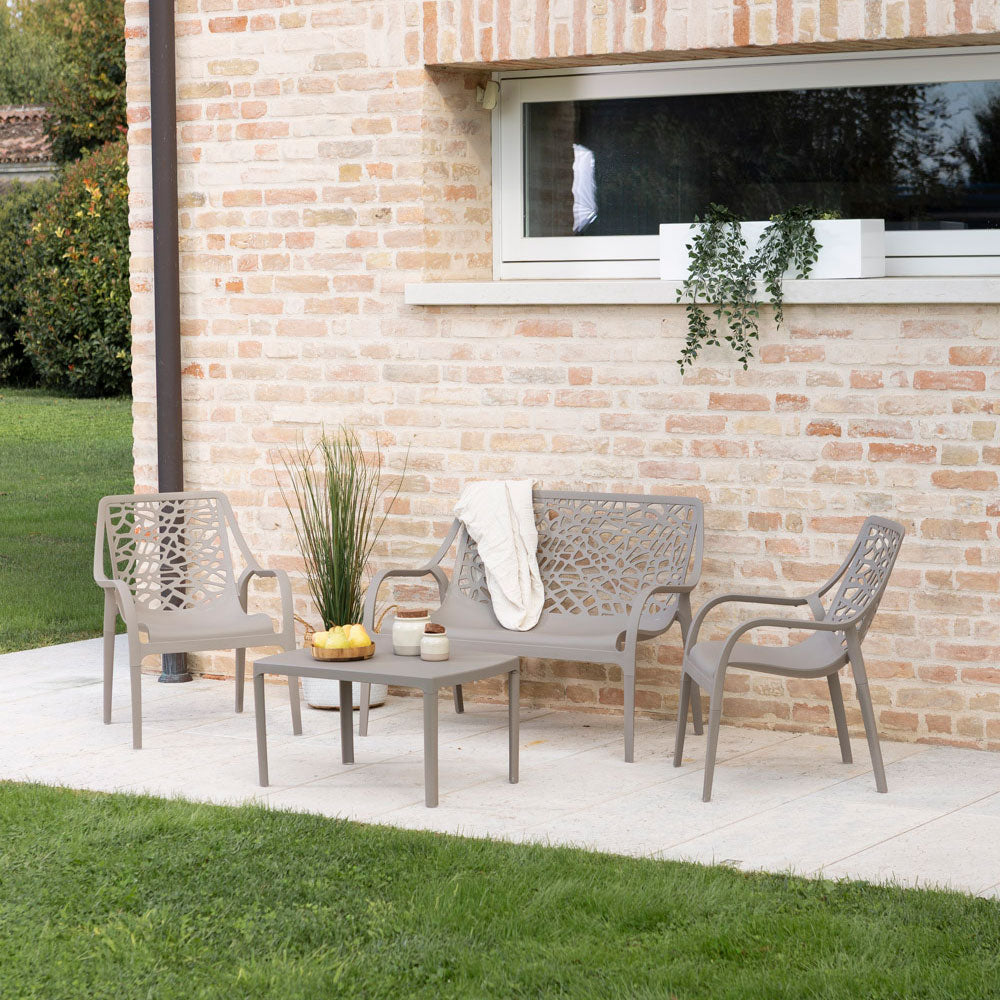 Realizzato in polipropilene rinforzato con fibra di vetro, il set è progettato per resistere agli agenti atmosferici, garantendo ottima durabilità nel tempo. È impermeabile, non teme pioggia e umidità, ed è facile da pulire, rendendolo ideale per giardini, terrazze e porticati. Inoltre, è dotato di piedini in gomma antiscivolo e protettivi.